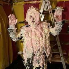 Megapies rolled around with PieInstructorPM on a tarp covered with batter